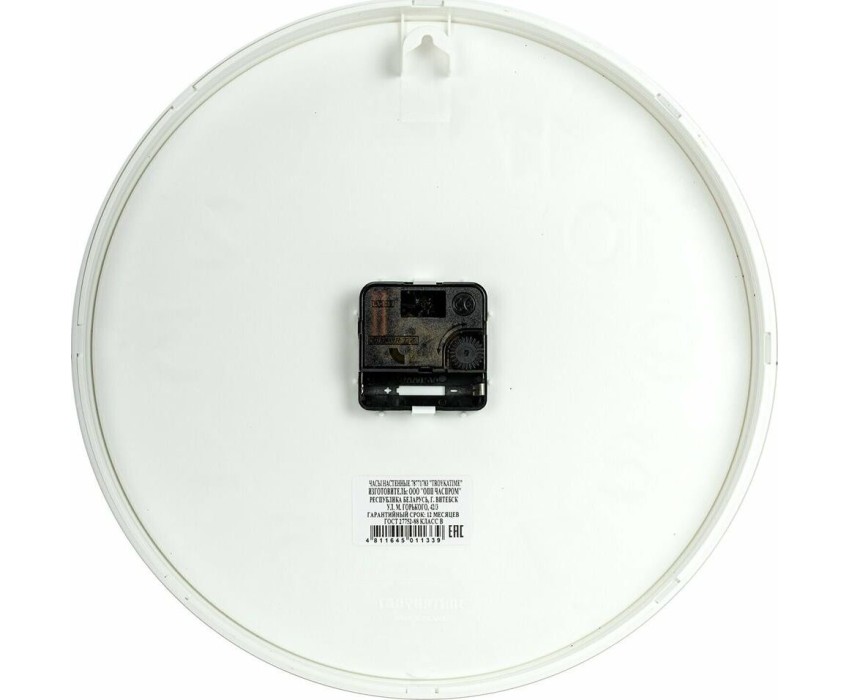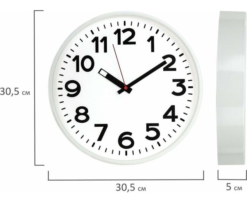 Категория: настенные, Тип механизма: кварцевый, Материал корпуса: пластик, Точный размер корпуса: 300х300х50 мм, Форма корпуса: круглые, Цвет корпуса: белый, Цвет циферблата: белый, Циферблат: стрелочный, Цифры: арабские, Ход: плавный.