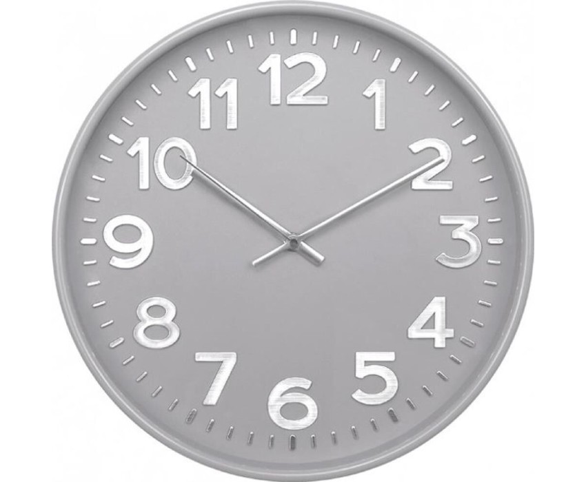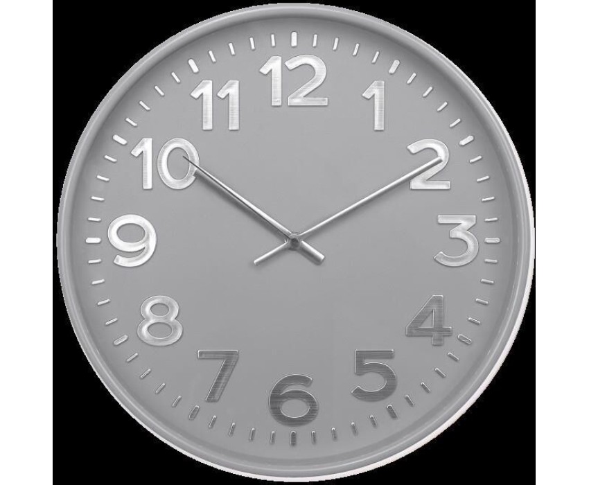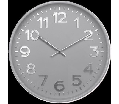 Часы настенные пластиковые, модель 78772784, размер 305*305*50 мм, стекло минеральное, пластиковый обод, цвет-серый глянцевый, рельефные цифры с тиснением фольгой под серебро.