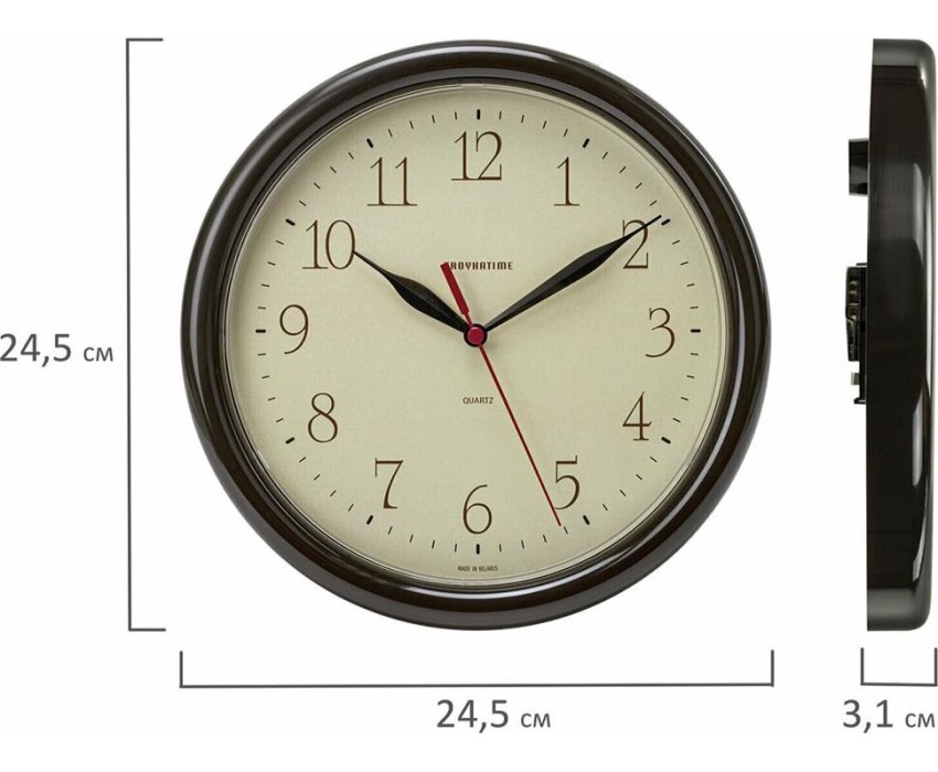 Категория: настенные, Тип механизма: кварцевый, Материал корпуса: пластик, Точный размер корпуса: 245х245х25 мм, Форма корпуса: круглые, Цвет корпуса: коричневый, Цвет циферблата: золотистый, Циферблат: стрелочный, Цифры: арабские, Ход: плавный.