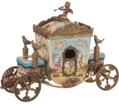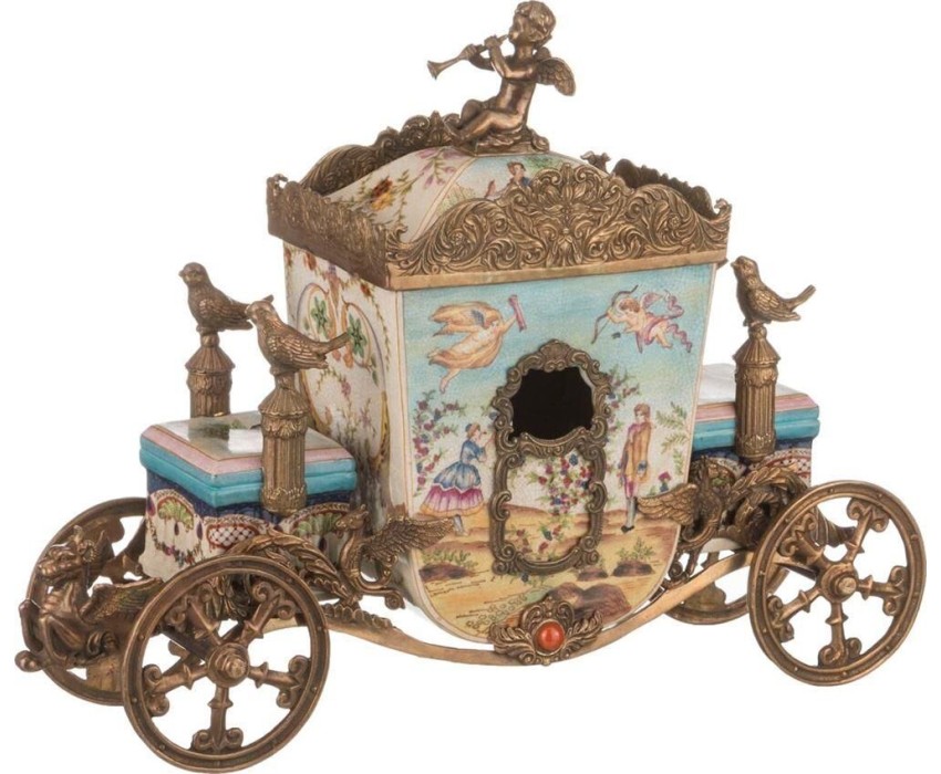 Изысканное декоративное изделие "Карета"словно пришла к нам из дворцовой эпохи XVIII века. Она так и сделана – вручную, под старину, с соблюдением традиций и технологий, которые складывались веками. Даже трещины на некоторых изделиях создавались специально и по особой технологии, чтобы передать винтажную атмосферу этих серий. Сегодня похожие предметы интерьера редко где встретишь - разве что в музеях или частных антикварных коллекциях.
