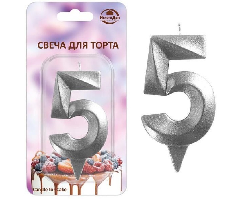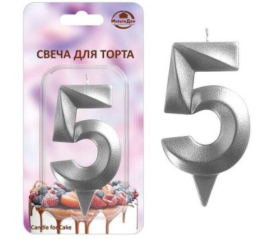 MULTIDOM Свеча для торта "Грань" цифра 5 (хром), 8,7х4,3х1,2 см. МС5-25