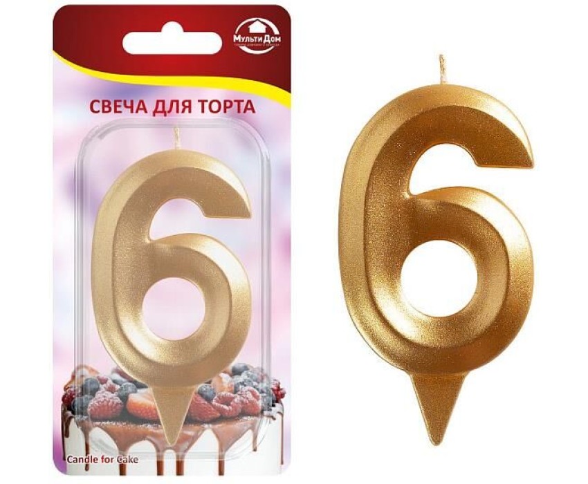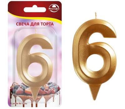 MULTIDOM Свеча для торта "Грань" цифра 6 (золото), 8,7 х 4,3х1,2 см. МС5-16