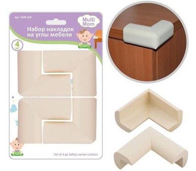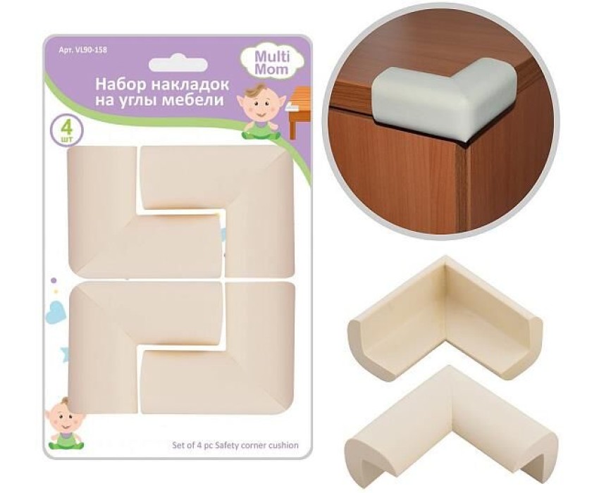 Оградить ребенка от острых углов помогут мягкие защитные накладки для столешниц, тумб, дверей шкафов. Уголки крепятся на двусторонний скотч, который не оставляет следов на поверхности и исключает скольжение уголков. В набор входят 4 уголка и двусторонняя липкая лента. Размеры сторон накладки по 7см, толщина 1см. Состав: полимерный материал (EVA-этиленвинилацетат).