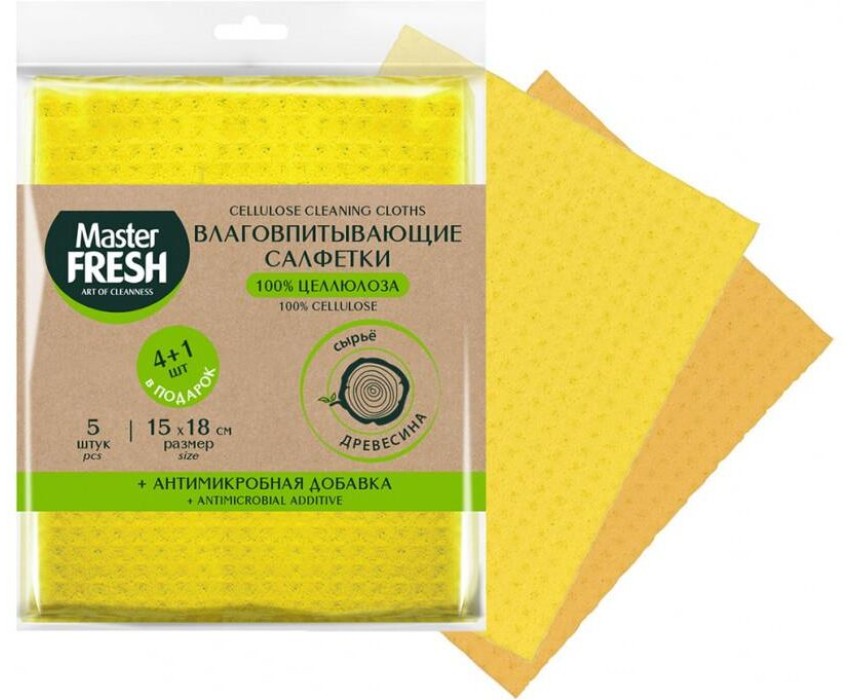 Набор салфеток MASTER FRESH С0007053 Master FRESH ЭКО салфетки целлюлозные + АНТИМИКРОБНАЯ добавка, 4+1шт В ПОДАРОК