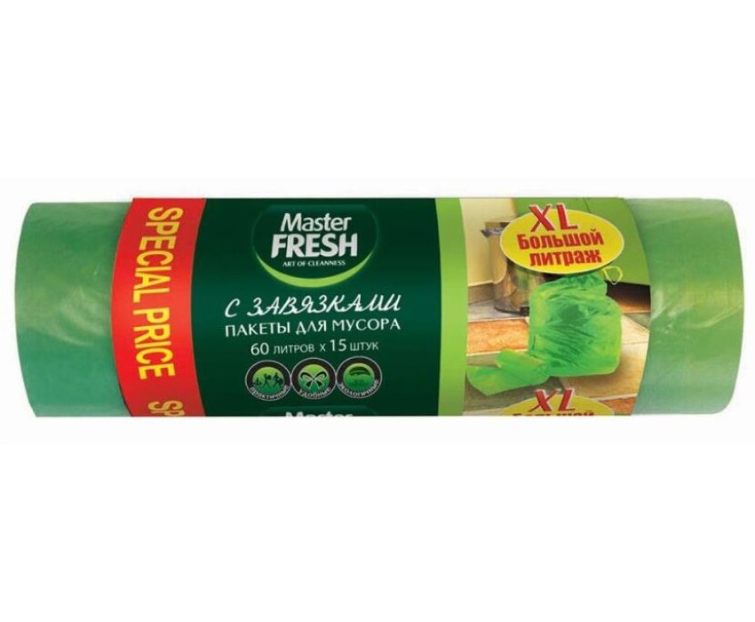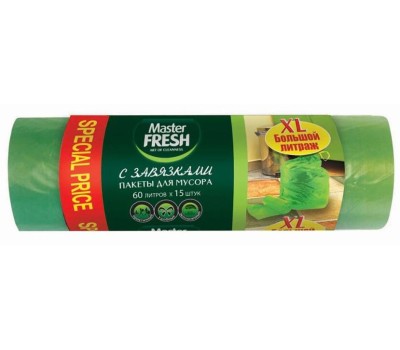 Мешки для мусора MASTER FRESH С0006163 Master FRESH MFGB60–15R пакеты для мусора XXL с завязками 60 литров, 15 штук (ЗЕЛЕНЫЕ)