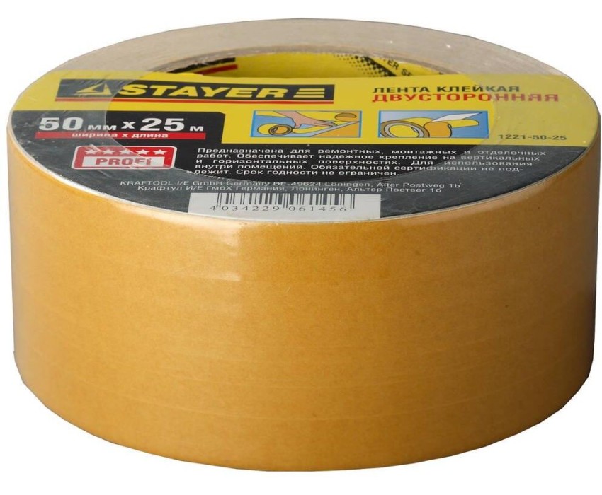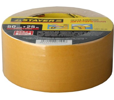STAYER 50 мм, 25 м, на полипропиленовой основе, двухсторонняя клейкая лента (1221-50-25)