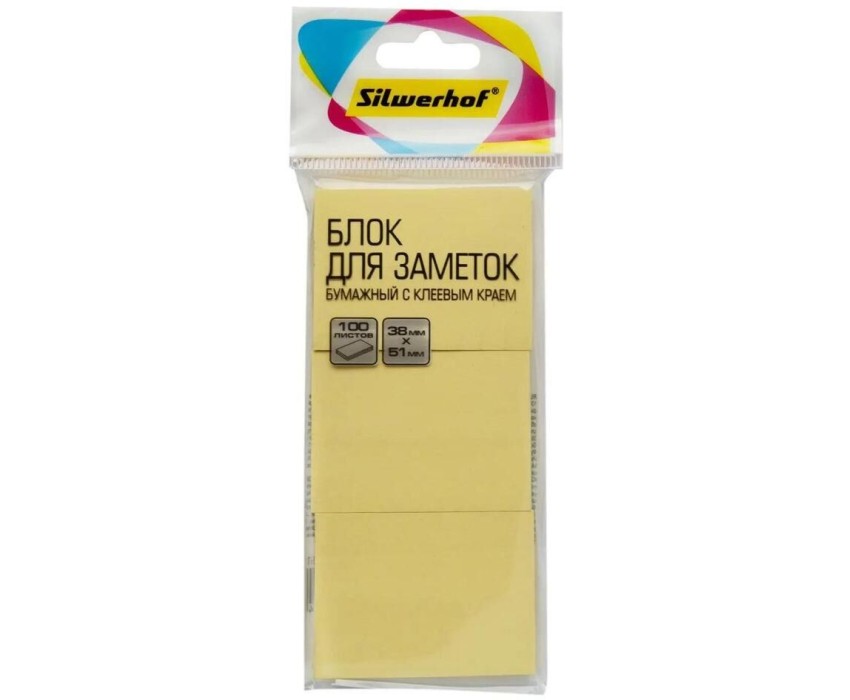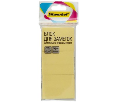 SILWERHOF Блок самоклеящийся бумажный 38x51мм 100лист. 75г/м2 пастель желтый европодвес (упак.:3шт)