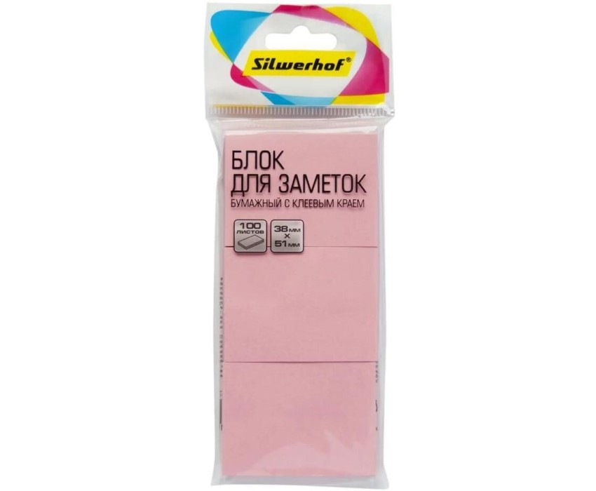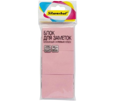 SILWERHOF Блок самоклеящийся бумажный 38x51мм 100лист. 75г/м2 пастель розовый европодвес (упак.:3шт)