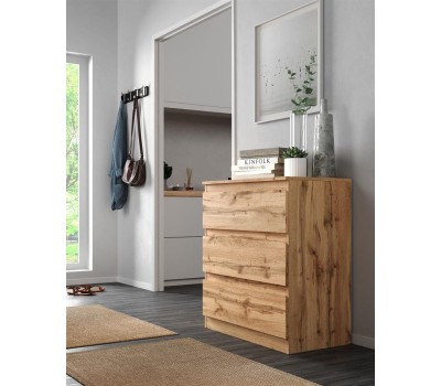 Комод с тремя ящиками. Корпус и фасад изготовлены из ЛДСП 16 мм. Функционально - широкий модульный ряд позволяет создавать любой интерьер. Эстетично - все фасады имеют скошенный край. Практично - вместительные выдвижные ящики на роликовых направляющих. Размер изделия (ШхВхГ) 78,2х85,7х43,3 см.