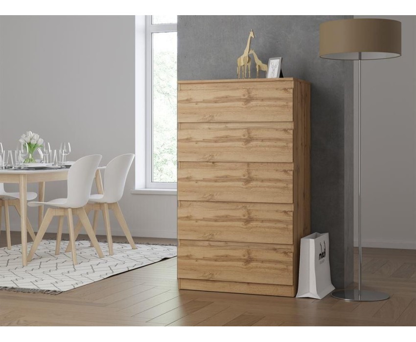 Комод с пятью ящикам. Корпус и фасад изготовлены из ЛДСП 16 мм. Три цвета на выбор - Белый, Дуб Сонома, Дуб Вотан. Функционально - широкий модульный ряд позволяет создавать любой интерьер. Эстетично - все фасады имеют скошенный край. Практично - вместительные выдвижные ящики на роликовых направляющих. Размер изделия (ШхВхГ)78,2 х 136,5 х 43,3 см.