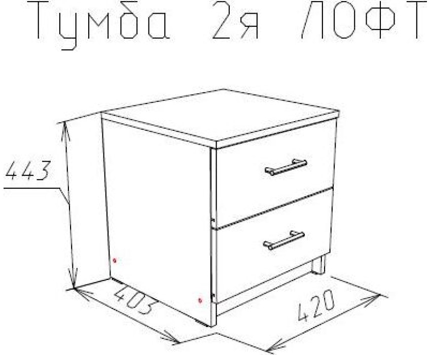 Комод Лофт оснащен 2 выдвижными ящиками. Роликовые ящики обеспечивают полное выдвижения ящиков, что облегчает хранение и использование. Подойдет в качестве прикроватной тумбы. Корпус и фасад изготовлен из ЛДСП 16мм. Размеры изделия (ШВГ): 42х44,3х40,3 см..