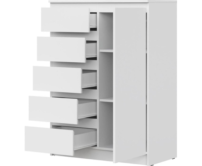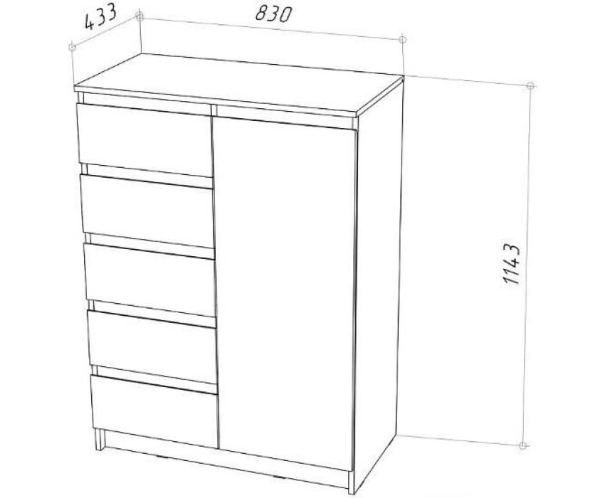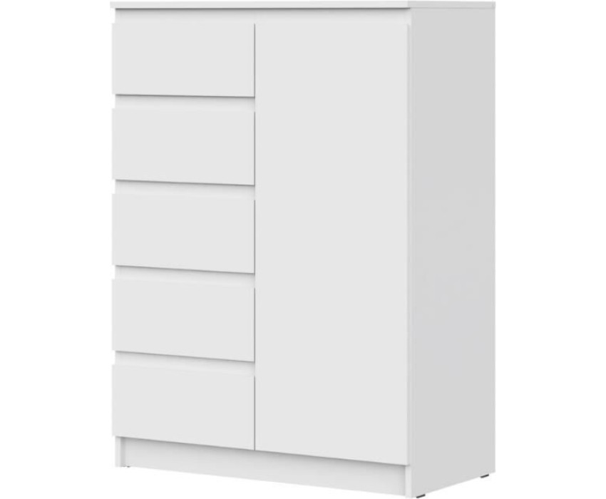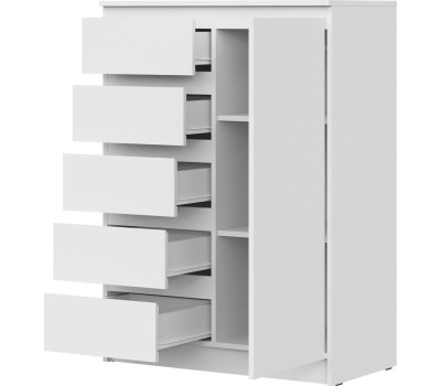 Удобный комод с 5 выдвижными ящиками и дверцой освободит место в квартире, позволяя удобно разместить предметы. Корпус и фасад изготовлены из ЛДСП 16 мм. Три цвета на выбор - Белый, Дуб Сонома, Дуб Вотан. Размер изделия (ШхВхГ) 83 х 114,3 х 43,3 см.