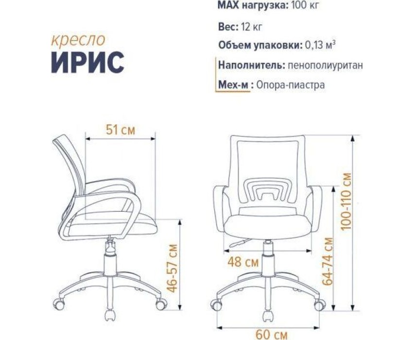 Крестовина: «Паук»600 мм. Подлокотники: пластик. Обивочные материалы: ткань серии «TW».Газпатрон: стандартный . Механизм: Топ-Ган (мезханизм качания с регулировкой жесткости и фиксацией в рабочем положении)/ Опора-пиастра. Ролик: пластик Размеры: В 1000-1110 Ш 480 Г 510 Габариты: Размеры коробки: 615/330/615 мм. Объем коробки: 0.13 куб. м. Вес: 12кг.