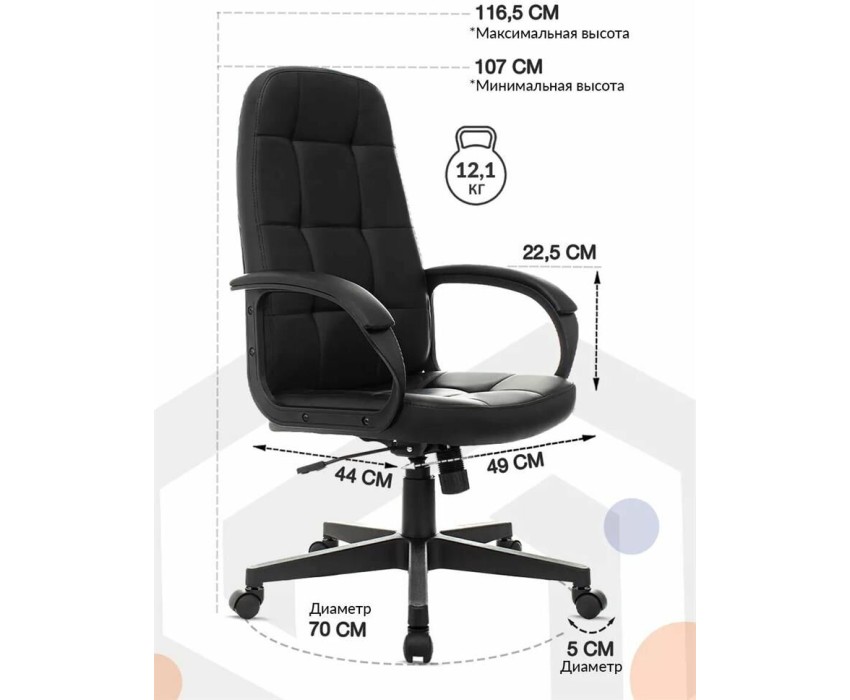 Тип: Кресло руководителя. Бренд: БЮРОКРАТ. Серия: CH. Модель: CH 002. PartNumber/Артикул Производителя: CH 002 3C11. Тип основания: на колесиках. Подлокотники: ДА. Тип подлокотников: с мягкими накладками. Механизм качания: ДА. Тип механизма качания: с фиксацией в вертикальном положении. Регулировка под вес: ДА. Регулировка высоты (газлифт): ДА. Цвет обивки: черный. Цвет (спинка): черный. Цвет каркаса: черный. Материал обивки: ткань. Серия обивки: Fabric. Материал основания: пластик. Диаметр колес: 50 мм. Материал колес: пластик. Высота кресла/стула MIN: 1070 мм. Высота сиденья MIN: 445 мм. Высота с подлокотниками MIN: 670 мм. Высота подлокотника MIN: 225 мм. Глубина сиденья MIN: 440 мм. Ширина с подлокотниками: 640 мм. Ширина сиденья: 490 мм. Диаметр креста: 700 мм. Ограничение по весу: 120 кг. Срок Гарантии: 24 мес.
