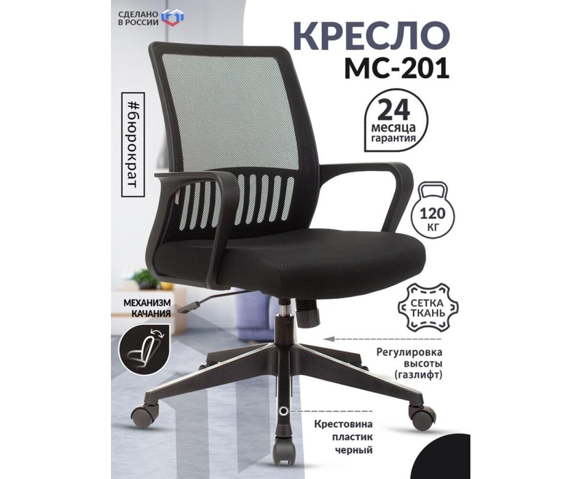 Кресло компьютерное БЮРОКРАТ Кресло MC-201, сетка/ткань, до 120кг, черный