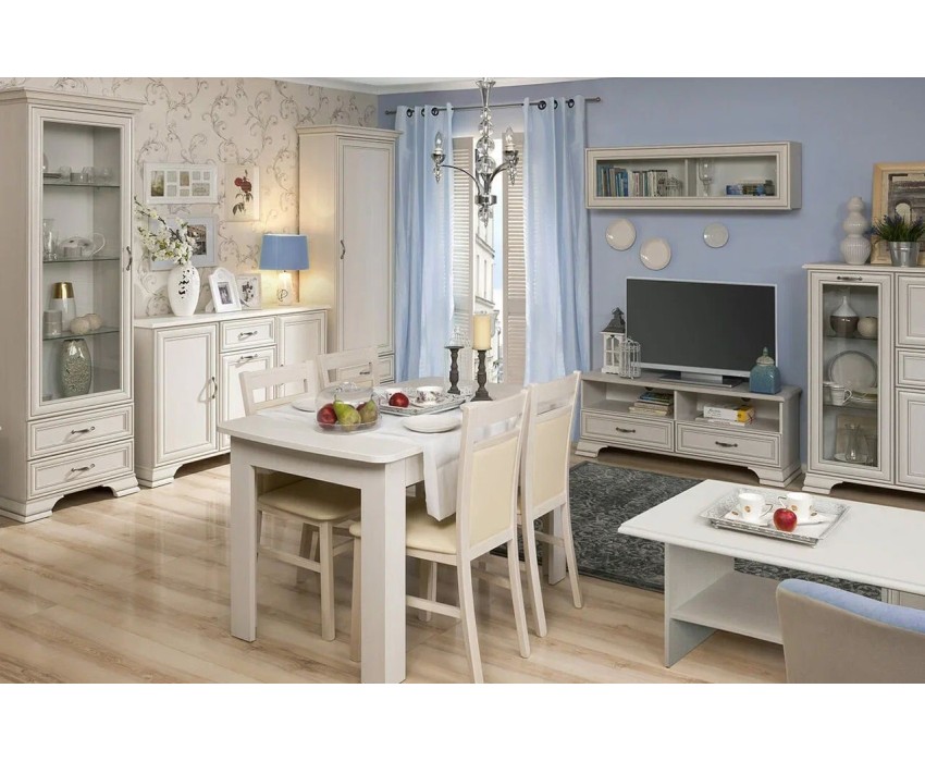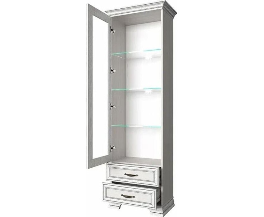 Особенности шкафа: Подчеркнёт роскошный интерьер в классическом стиле гостиной и столовой комнаты. Отделение с полками за витриной и два выдвижных ящика. Рамочно-филенчатый фасад (патинированная планка из МДФ, филенка - ЛДСП). Металлические ручки (сплав цинка и алюминия). Шариковые направляющие полного выдвижения. Декоративная корона, ножки из МДФ. Полки из закалённого стекла толщиной в 6 мм, витрина – 4 мм. Имеет универсальную сборку.