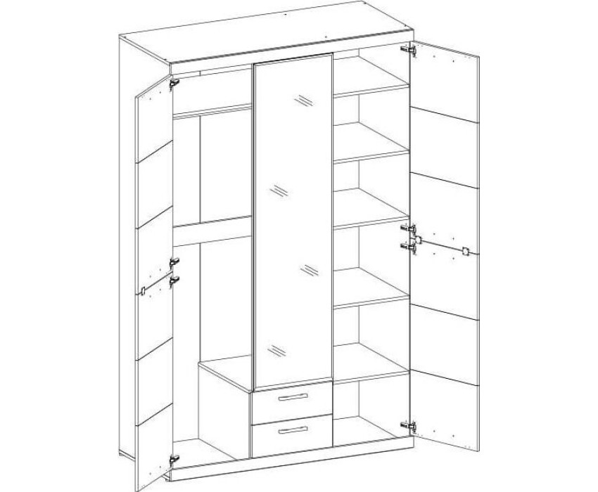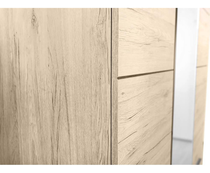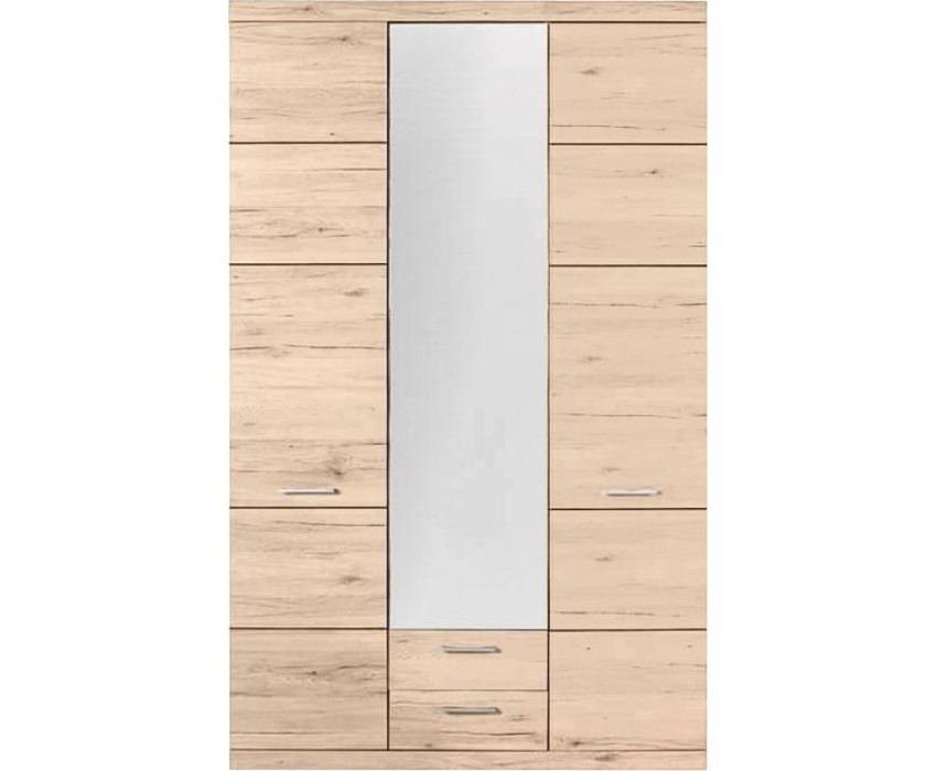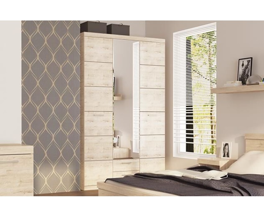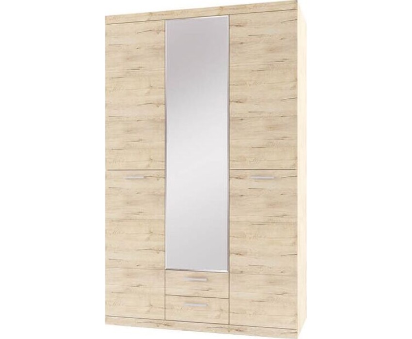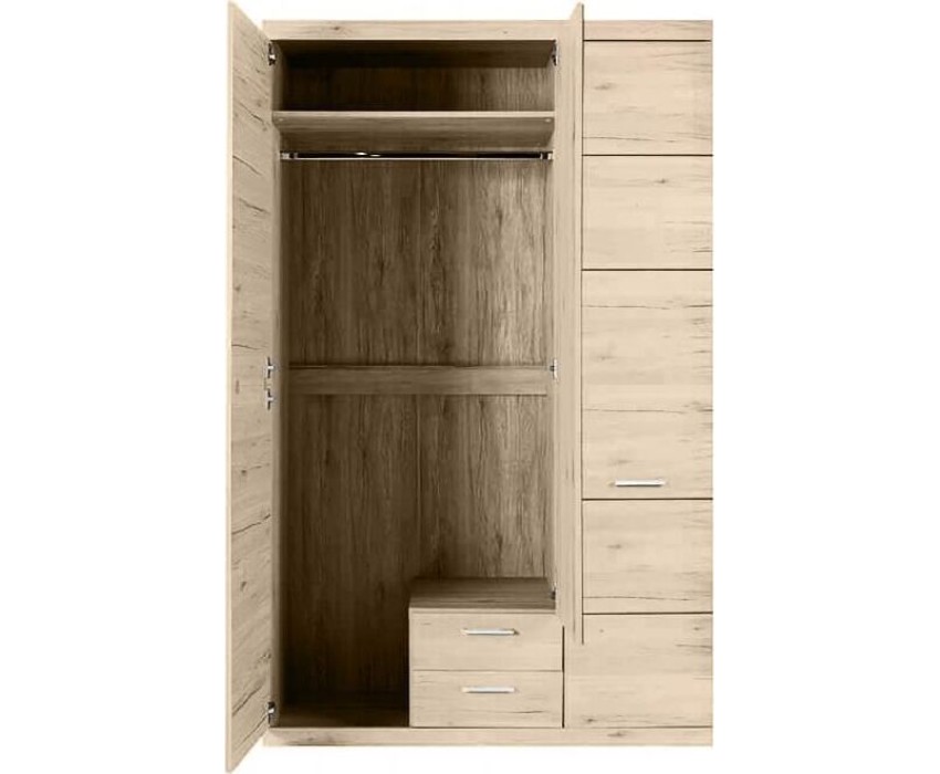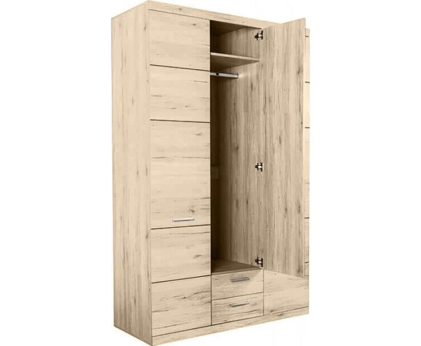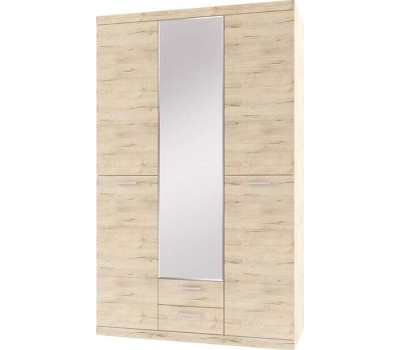 Шкаф Оскар 3D2SZ – замечательное дополнение для организации спальни в стиле кантри. Глубокий древесный рисунок и цвет плиты подчёркнут уютную обстановку. Уникальность элементу придают сборные фасады. Шкаф Оскар 3D2SZ прямой. Конструкция элемента представляет собой одно гардеробное отделение с одной штангой и нишей сверху за двумя глухими дверями, одно отделение с полками из ЛДСП за глухой дверью, два выдвижных ящика (2S). Двери (3D) распашные, крепятся на петли к боковому корпусу и внутренней перегородке. На средней двери (снаружи) крепится зеркало (Z).