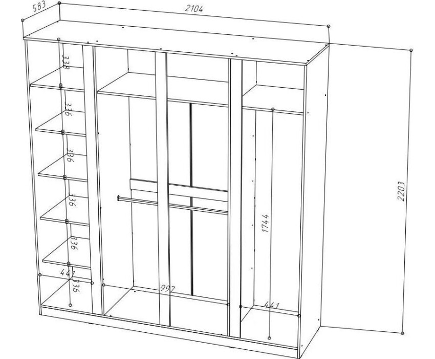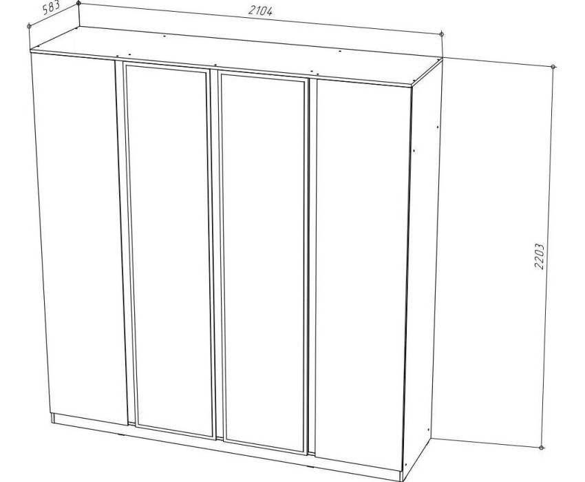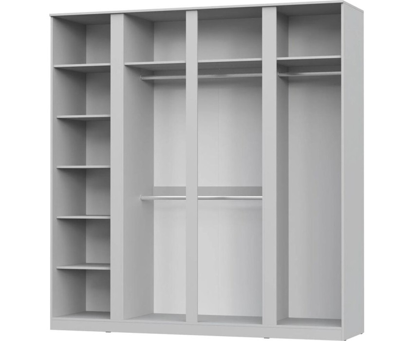 Шкаф Stern с четырьмя распашными дверцами, оборудован полками и штангами для хранения одежды.Корпус изготовлен из ЛДСП 16мм., фасад ЛДСП / зеркало. Размеры изделия (ШВГ): 210,4 х 220,3 х 58,3 см..