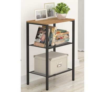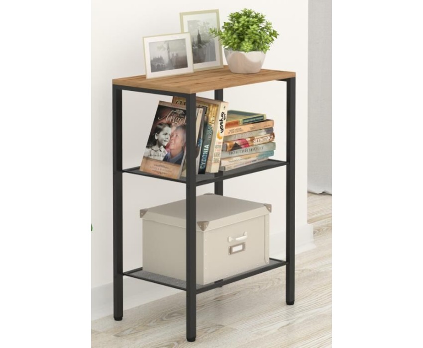 Изделие предназначено для хранения домашних и офисных предметов. Представляет собой стеллаж с 3 полками, выполненными из просечно-вытяжного листа и верхней полки из ЛДСП. Разборный каркас состоит из стальной профильной трубы 15х25 мм. В комплект входят регулируемые пластиковые опоры. Все изделие окрашено однотонной, порошковой краской. Допустимая нагрузка на полки до 8 кг.