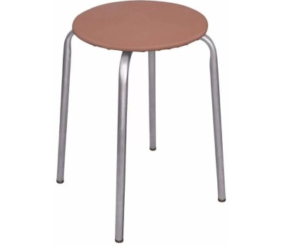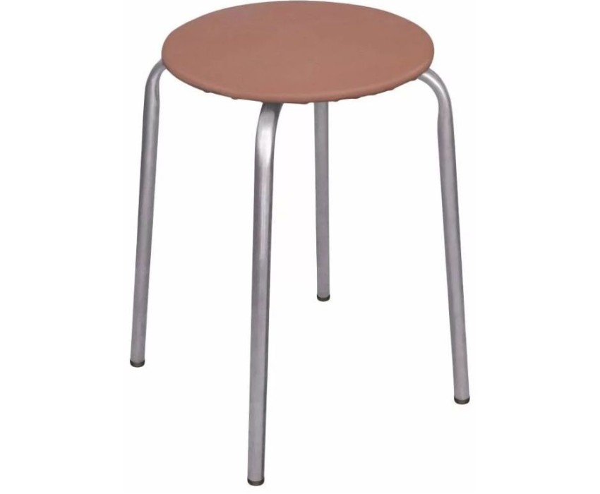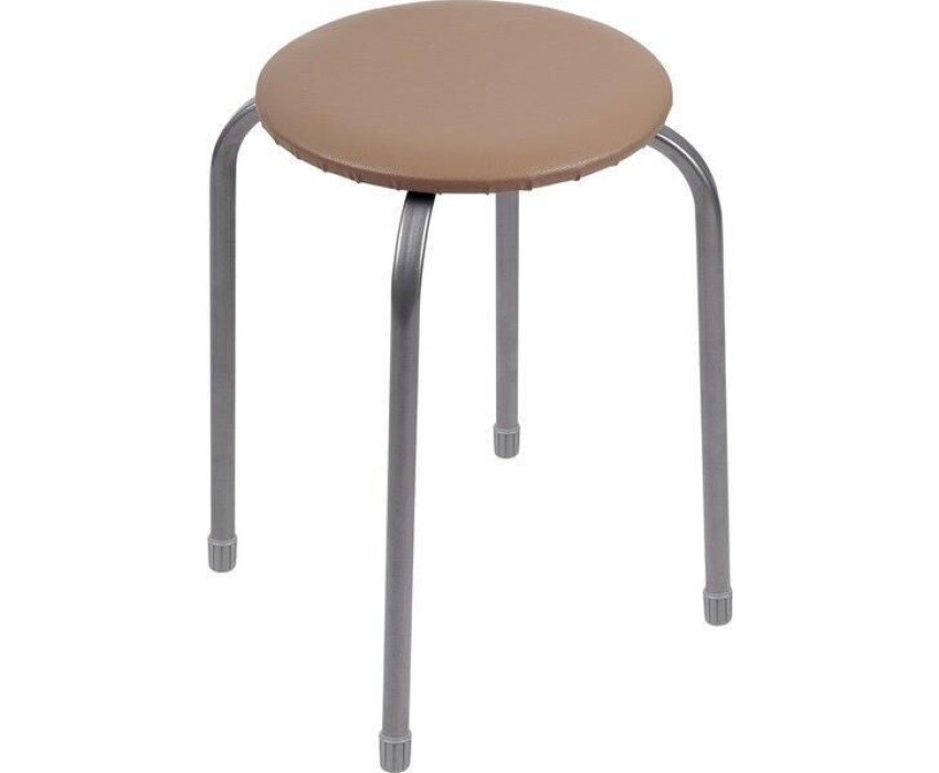 На 4-х опорах, мягкое круглое сидение, легко штабелируются, материал сиденья прочный, устойчивый к истиранию и легкий в чистке, пластиковые колпачки на ножках защищают поверхность пола от царапин, допустимая нагрузка не более 100кг , каркас - стальная труба, сиденье - винилискожа, основание - МДФ, колпачки на ножках - пластик.