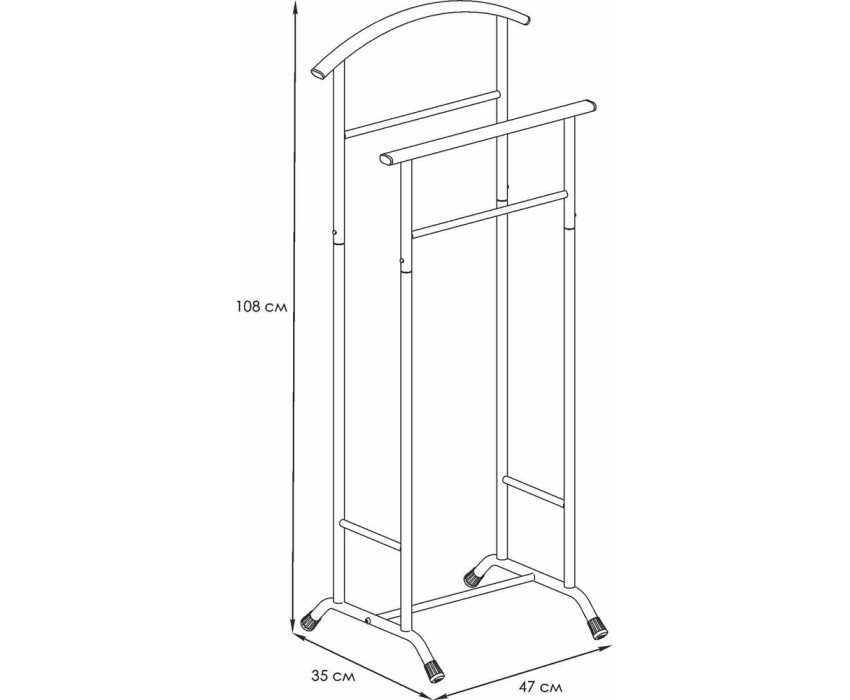 Отличительные особенности: - надежная сварная конструкция. - вместительная модель, на которую с легкостью можно уместить полный комплект костюма – пиджак, рубашку, брюки и галстук. - изящная форма изделия прекрасно впишется в любой интерьер. - нагрузка на плечико - 3кг. - общая нагрузка - 10 кг. Материал Сталь, полимерное покрытие, пластик. Габариты (Д*Ш*В) 47х35х108 см.