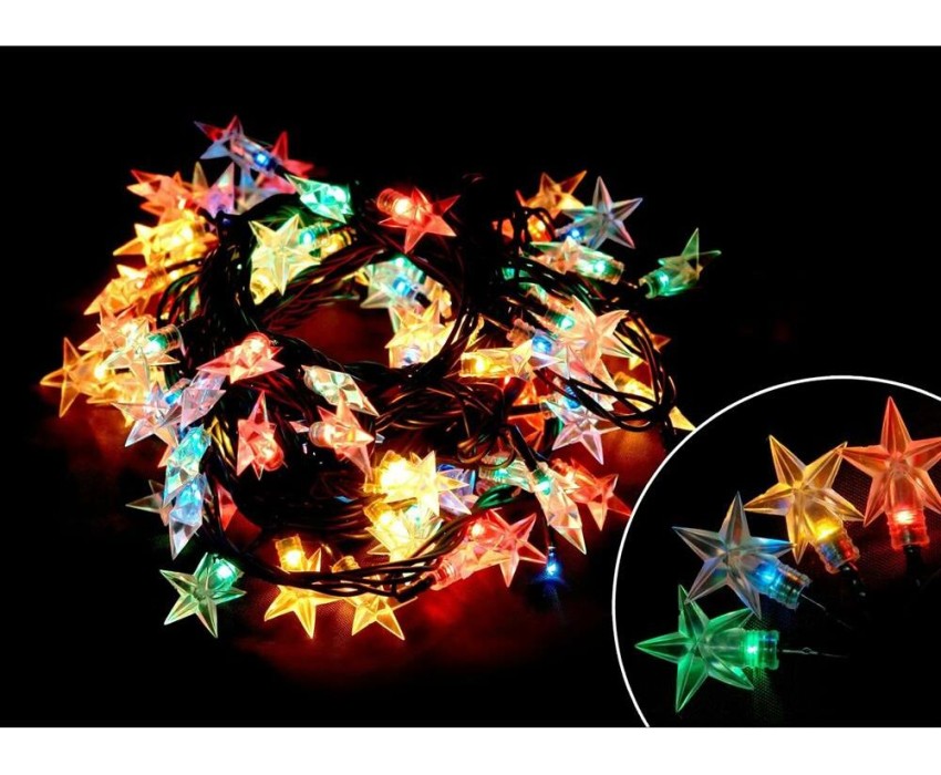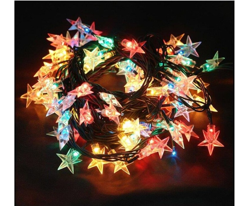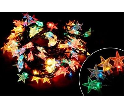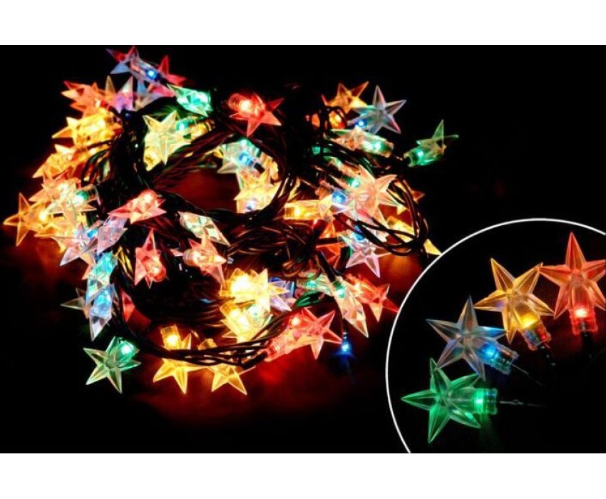 Электрогирлянда "Звезды" Star-100-5-MC. многоцветная. 100 рисовых ламп. длина рабочей части 5м. 8 режимов работы. орнамент - прозрачные звездочки. шнур зеленый. питание от сети 220-240В, 50 Гц. для использования внутри помещений, класс защиты IP20. мощность 31Вт. картонная коробка. ПВХ, алюминий, медь, лампы.