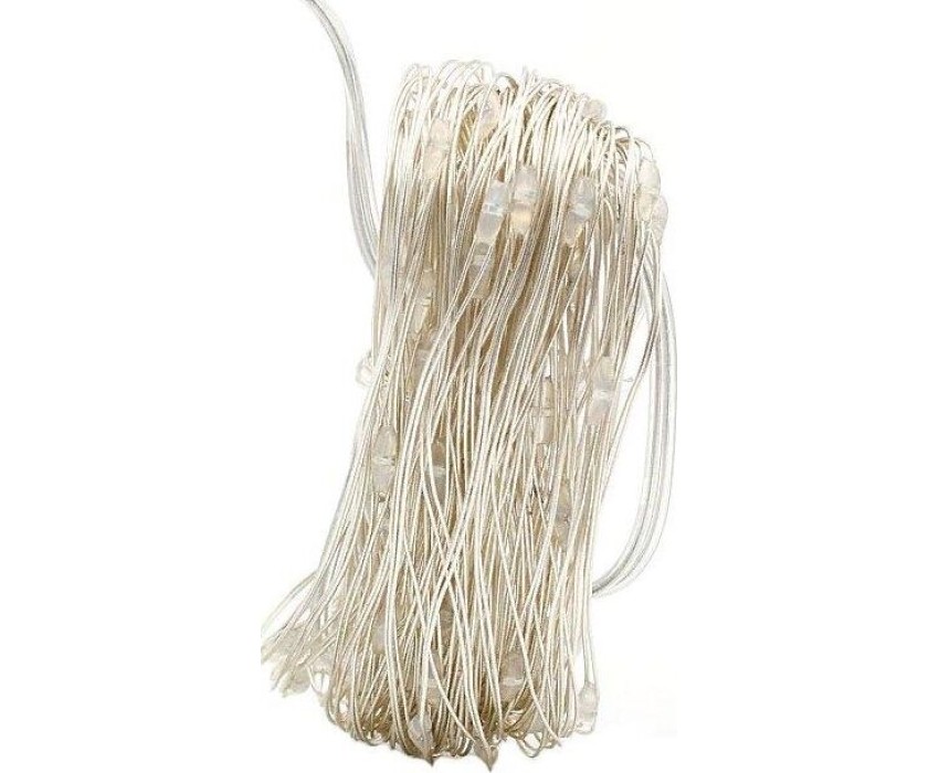 Электрогирлянда светодиодная "Дождик". белый теплый. 100LED ламп, 10 нитей по 10LED ламп, длина 1м, гибкие. без мигания. питание от сети 220-240В, 50 Гц , мощность 3,6Вт. для использования внутри помещений класс защиты IP20. прозрачный провод. материал: ПВХ, алюминий, медь, лампы.
