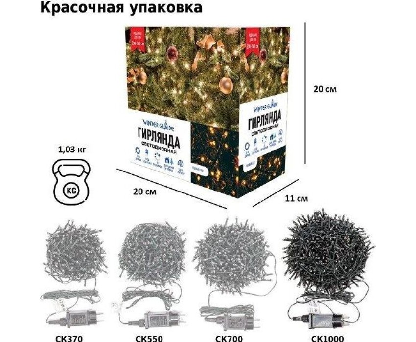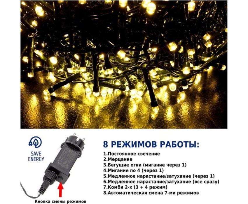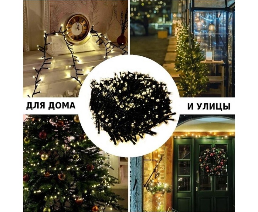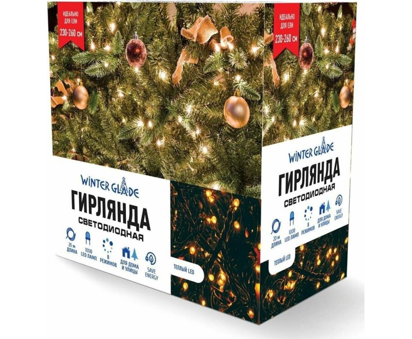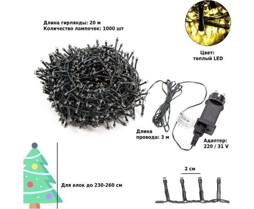 Длина гирлянды: 2000 см. Длина провода: 3 м. Подходит для елки: 230-260 см. Количество лампочек: 1000 штук. Цвет лaмпочек: теплый LED. Расстояние между лампочками: 2 см. Цвет проводa: темно-зеленый. Количество режимов: 8 штук. Питaние: адaптер (входящeе нaпряжение - 220V; иcходящее - 31V). Применение: внутри/снаружи помещения.