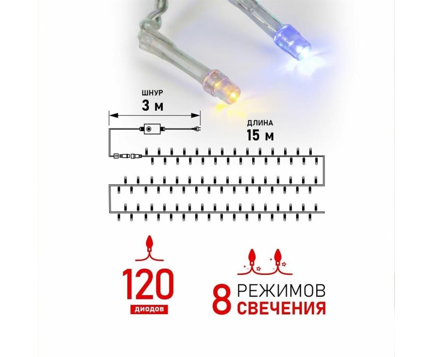 Гирлянда NEON-NIGHT (303-199) ГИРЛЯНДА "ТВИНКЛ ЛАЙТ" 15 М, ПР-Й ПВХ, 120 LED, МУЛЬТИ