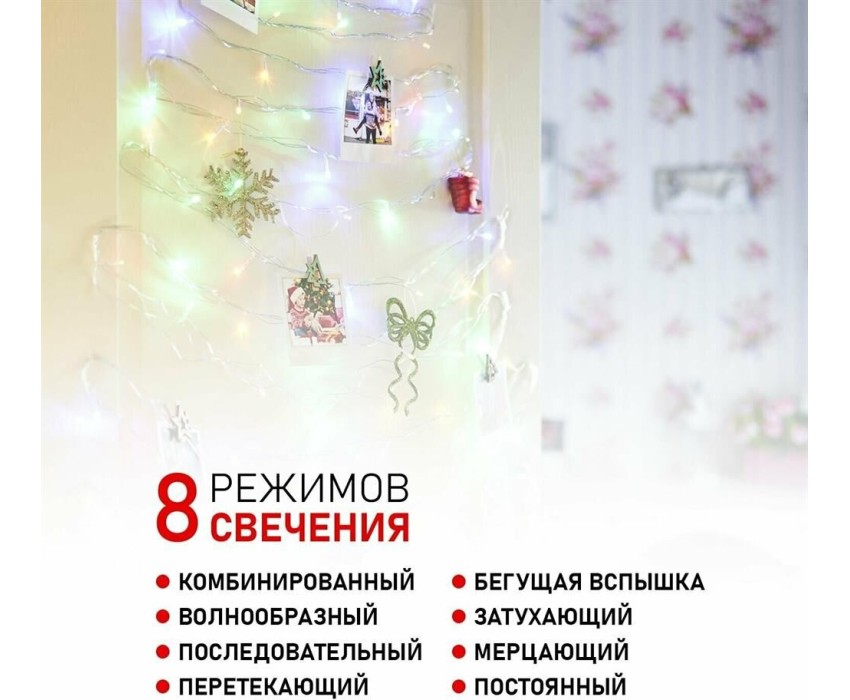 Благодаря встроенному контроллеру, гирлянда имеет 8 разнообразных режимов свечения: комбинированный, волнообразный, последовательный, перетекающий, бегущая вспышка, затухающий, мерцающий, постоянный. Длина шнура подключения составляет 3 метра