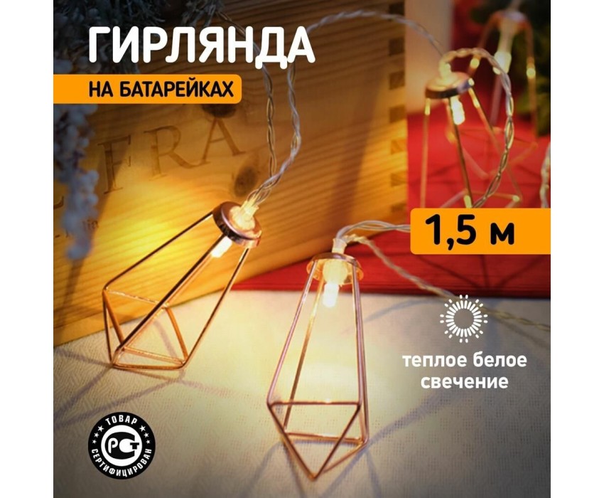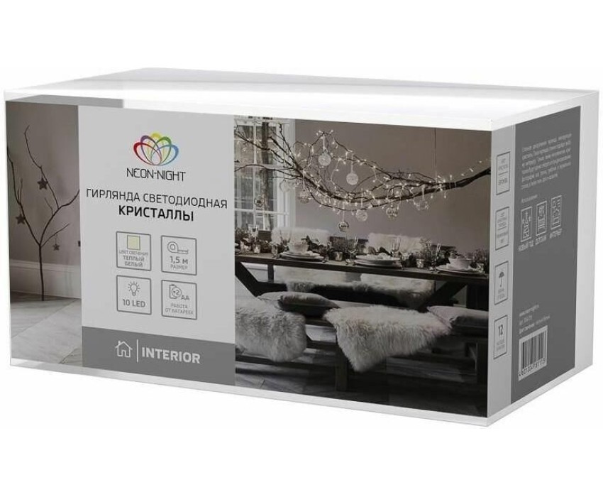 Светодиодная гирлянда Кристаллы NEON-NIGHT станет прекрасным решением для создания праздничной атмосферы и уюта в интерьере. С помощью гирлянды можно украсить карниз в спальне, стены в детской, фотозону или даже офисное помещение. Благодаря яркому дизайну можно создать стильный интерьерный акцент даже в выключенном состоянии. Всего на гирлянде 10 бронзовых кристаллов, светящихся теплыми белыми диодами, расположенных на расстоянии 16,67 см друг от друга. Работает от 2 батареек типа АА (не в комплекте).