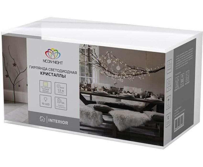 Светодиодная гирлянда Кристаллы NEON-NIGHT станет прекрасным решением для создания праздничной атмосферы и уюта в интерьере. С помощью гирлянды можно украсить карниз в спальне, стены в детской, фотозону или даже офисное помещение. Благодаря яркому дизайну можно создать стильный интерьерный акцент даже в выключенном состоянии. Всего на гирлянде 10 черных кристаллов, светящихся теплыми белыми диодами, расположенных на расстоянии 16,67 см друг от друга. Работает от 2 батареек типа АА (не в комплекте).