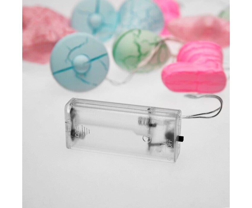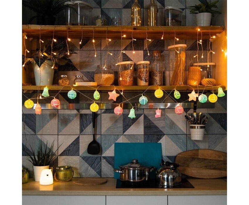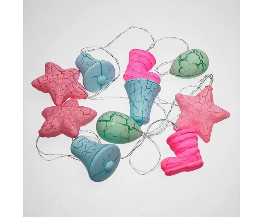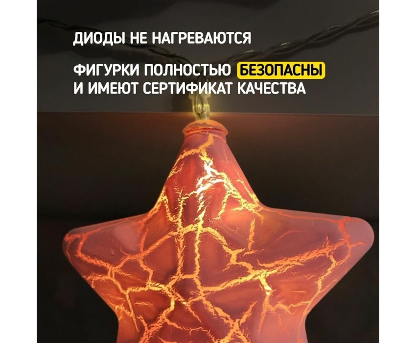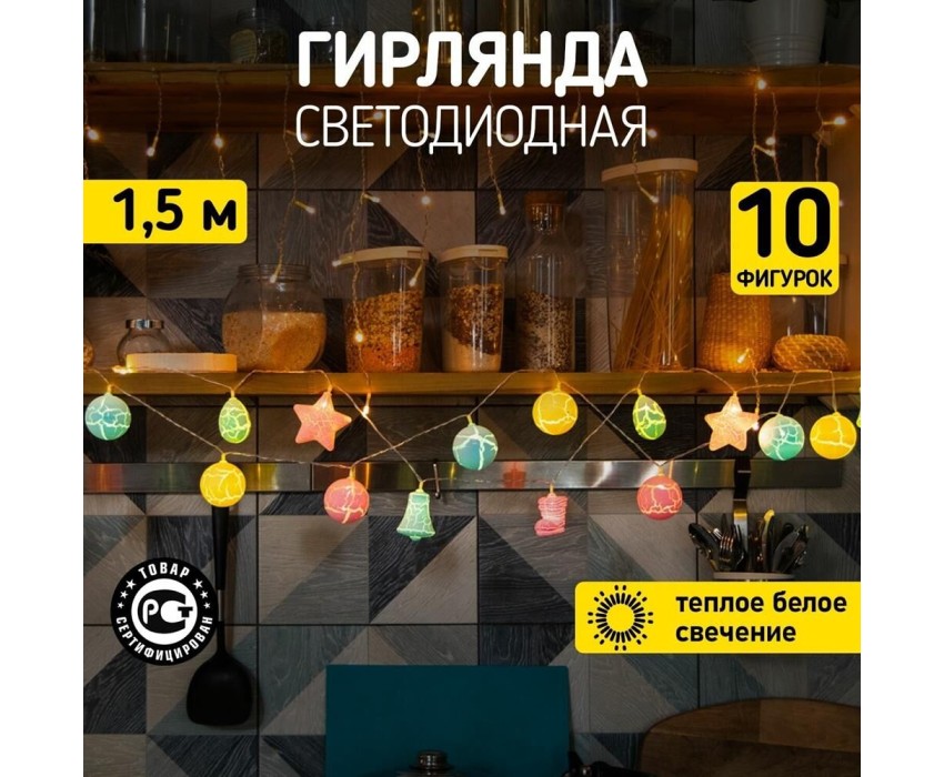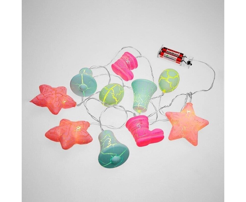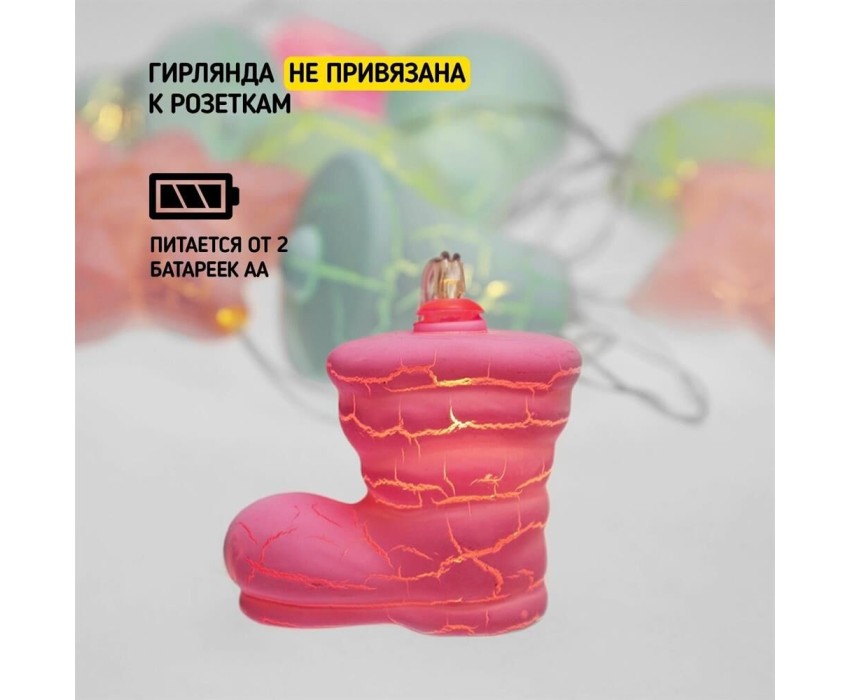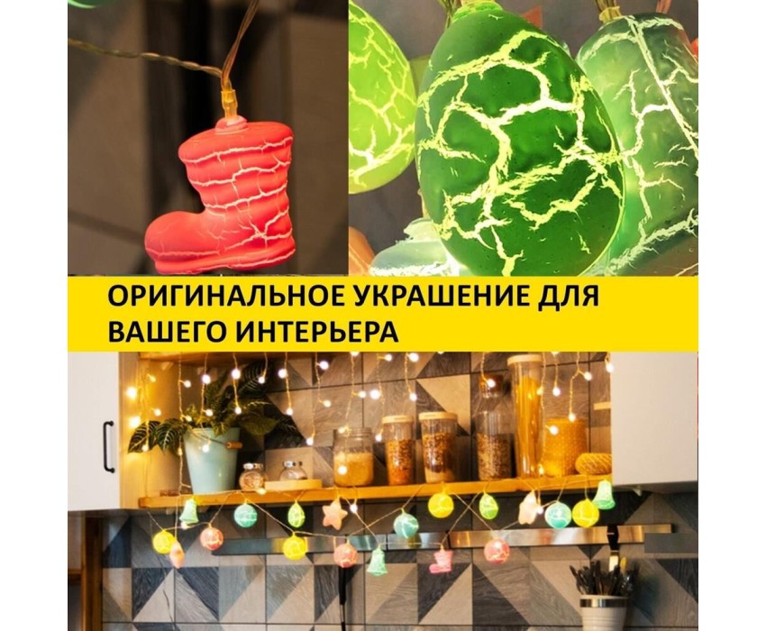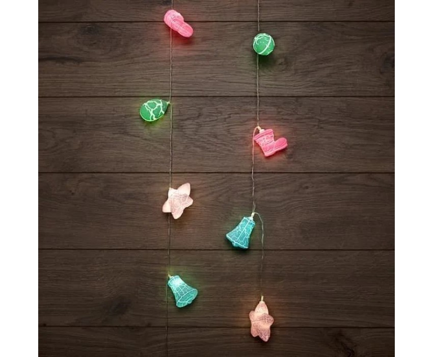 "Светодиодная гирлянда «Новый год» представляет собой гирлянду типа «Твинкл-Лайт», но на каждой нити теперь не просто яркий диод, а насадки в виде звезды, колокольчика, сапожка и шишки. Данная гирлянда станет отличным украшением не только новогодней ели, но и любого места в интерьере. Такая универсальность и удобство достигнуты батарейным блоком питания типа AA (2 шт.), что позволяет использовать гирлянду независимо от сети переменного тока."