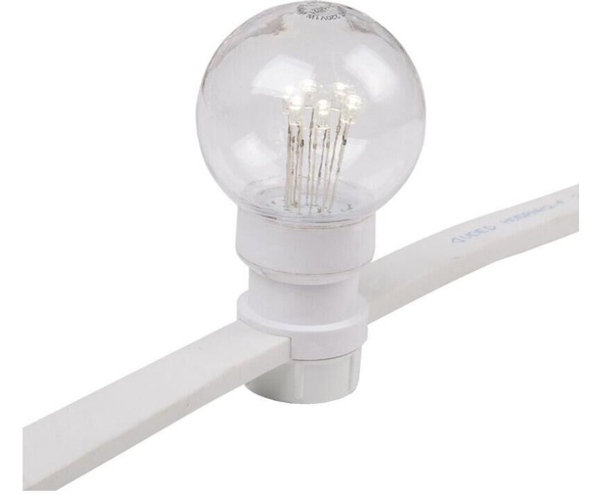 "Гирлянда ""LED Galaxy Bulb String"" внешне схожа с гирляндой Belt-light. Отличается она тем, что уже готова к использованию, на шине через каждые 33 см уже смонтированы прозрачные лампочки диаметром 45 мм, в каждой из которой есть 6 диодов. Благодаря своей степени защиты гирлянда может быть использована как в помещении, так и на улице, даже в сильный мороз. Данная гирлянда имеет длину 10 м, на которой равномерно расположено 30 лампочек белого цвета свечения."
