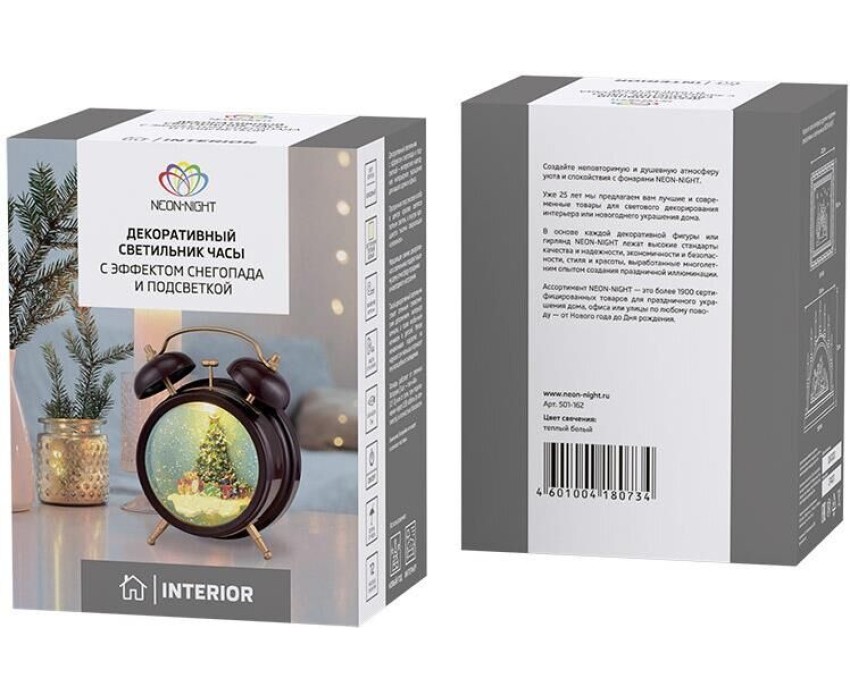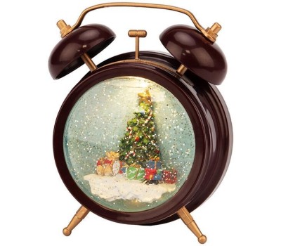 Декоративный светильник «Часы» выполнен в виде классического будильника, у которого вместо циферблата установлена прозрачная колба со специальной жидкостью. Внутри находится яркая композиция из новогодней елки, окруженной подарками. 2 диода, излучающих теплый белый свет, создают эффектную подсветку, которая может использоваться во время ночного сна. Золотистое конфетти имитирует зимний снегопад и заставляет подолгу наблюдать за причудливым танцем сверкающих частиц. Светильник питается от 3 батареек типа АА, что гарантирует полную безопасность использования. В комплекте идет USB-кабель.