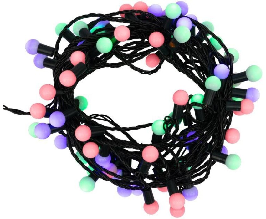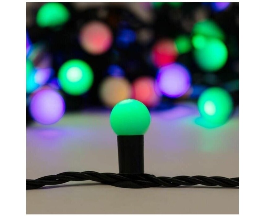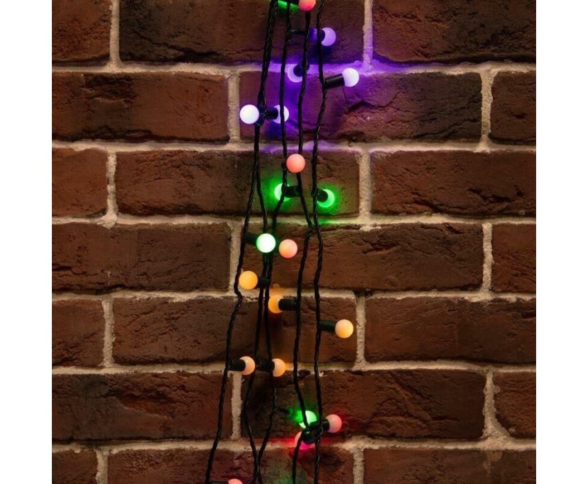 Гирлянда «Мультишарики» представляет собой электрический шнур, имеющий длину 10 м, на котором располагаются сверх яркие светодиодные лампы, изготовленные в виде шариков с диаметром 1,75 см. Светодиоды по сравнению с миниатюрными лампами накаливания имеют целый ряд существенных преимуществ. Их отличает чистое и яркое свечение, огромный ресурс, прочность, незначительное потребление энергии, надежность. Гирлянда «Мультишарики» великолепно подходит для украшения витрин магазинов, помещений, больших интерьерных и уличных елок, превращая их в настоящие произведения искусства. Благодаря хорошей влагозащищенности гирлянду можно использовать как в помещении, так и на улице. Данная гирлянда имеет цвет свечения светодиодов мультиколор, 8 режимов.