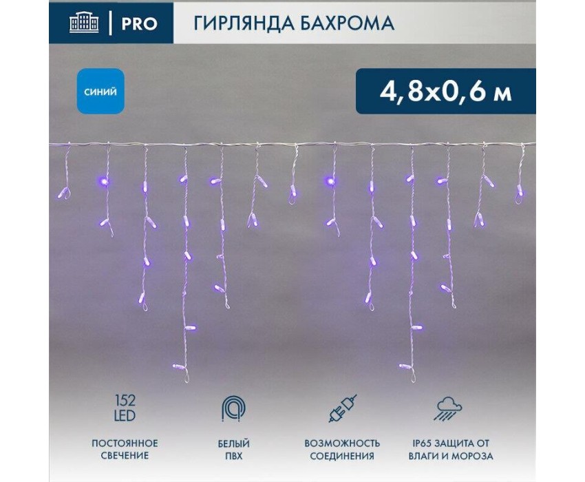 NEON-NIGHT Гирлянда светодиодная Бахрома (Айсикл) 4,8х0,6м 152 LED СИНИЙ белый ПВХ IP65 постоянное свечение 230В нужен блок 303-500-1