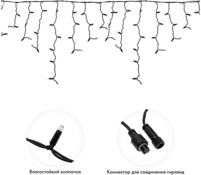 Гирлянда имитирует сосульки и может послужить оригинальным решением при украшении карнизов, арок, фасадов зданий, витрин магазинов, а также стать эффектным элементом декора внутри помещений.
