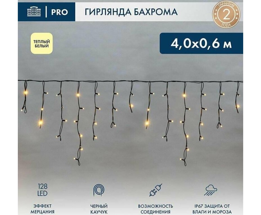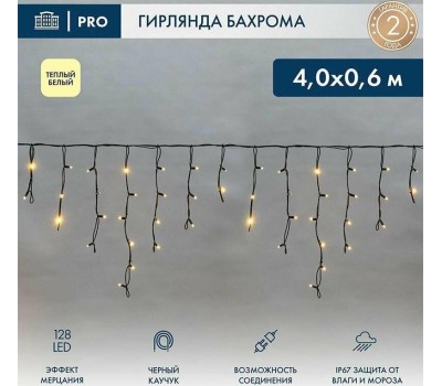 NEON-NIGHT Гирлянда светодиодная Бахрома (Айсикл) 4,0х0,6м 128 LED ТЕПЛЫЙ БЕЛЫЙ черный каучук 2,3мм IP67 эффект мерцания 230В нужен блок 315-000