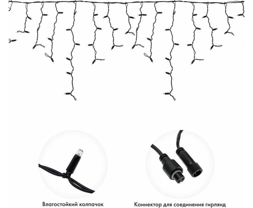 Гирлянда имитирует сосульки и может послужить оригинальным решением при украшении карнизов, арок, фасадов зданий, витрин магазинов, а также стать эффектным элементом декора внутри помещений.