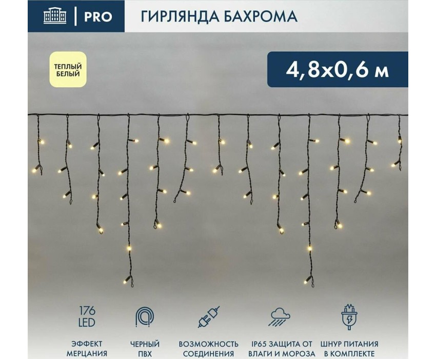 NEON-NIGHT Гирлянда светодиодная Бахрома (Айсикл) 4,8х0,6м 176 LED СИНИЙ черный ПВХ IP65 эффект мерцания 230В нужен блок 303-500