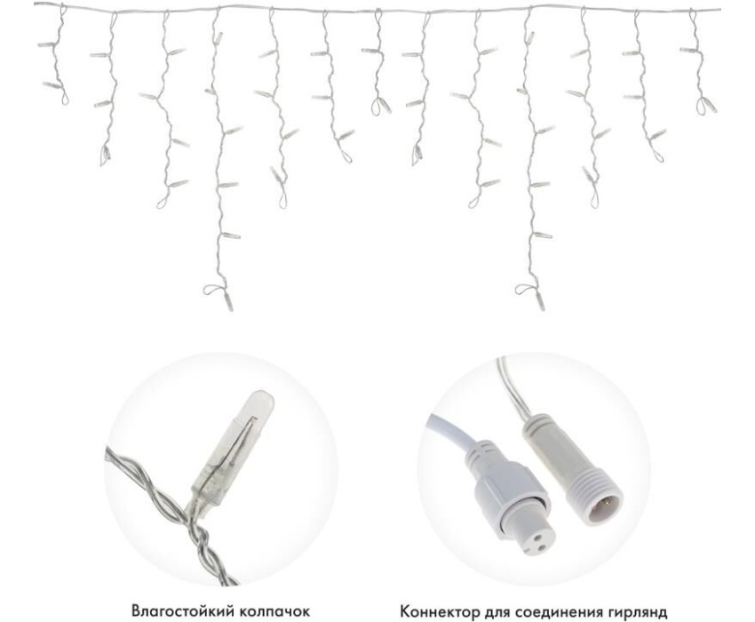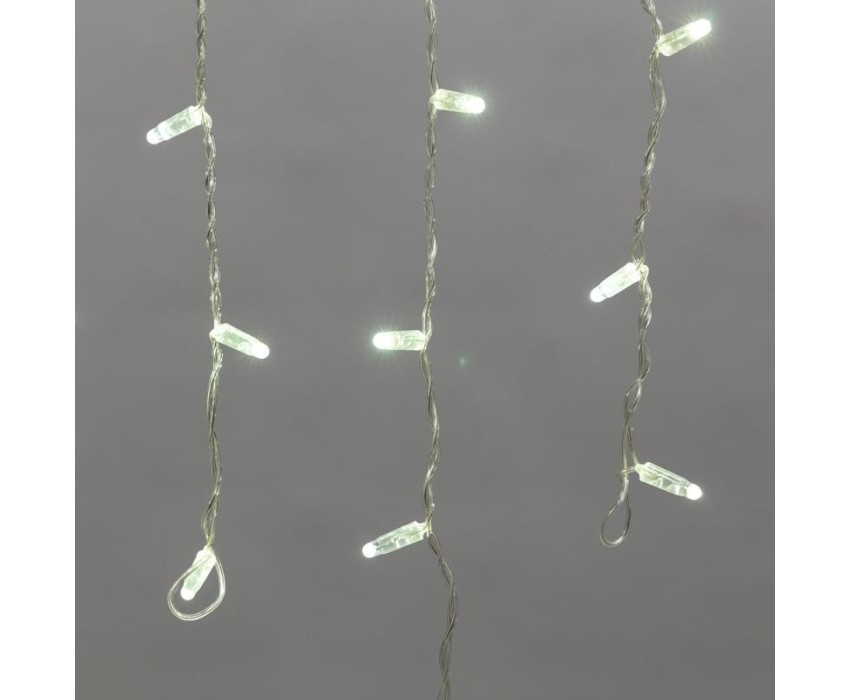 Гирлянда Айсикл (Бахрома) представляет собой гибкий горизонтальный шнур-шину, к которому через определенные промежутки крепятся вертикальные нити разной длины со светодиодами. Гирлянда имитирует сосульки и может послужить оригинальным решением при украшении карнизов, арок, фасадов зданий, витрин магазинов, а также стать эффектным элементом декора внутри помещений. При длине 4,8 м гибкая направляющая имеет 48 вертикальных нитей от 20 до 60 см. Благодаря использованию светодиодов отличительной особенностью гирлянды является превосходная яркость и низкое энергопотребление. Данная гирлянда имеет белый цвет свечения и предназначена для использования как внутри помещений, так и снаружи. Наличие мерцающих светодиодов белого цвета привлекает внимание и значительно преображает украшенную поверхность (мерцает каждый пятый светодиод).