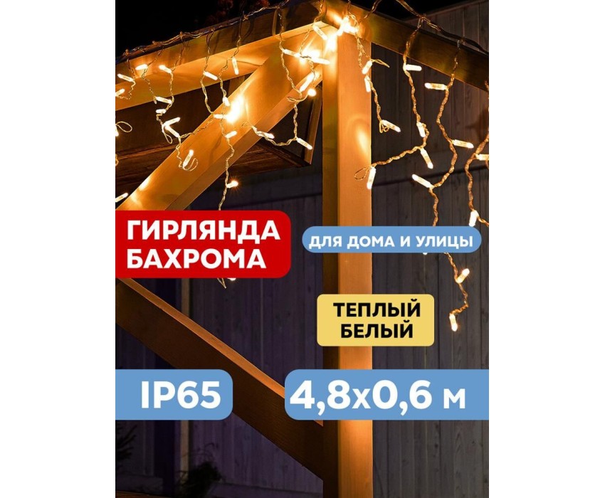 Гирлянда Айсикл (Бахрома) представляет собой гибкий горизонтальный шнур-шину, к которому через определенные промежутки крепятся вертикальные нити разной длины со светодиодами. Гирлянда имитирует сосульки и может послужить оригинальным решением при украшении карнизов, арок, фасадов зданий, витрин магазинов, а также стать эффектным элементом декора внутри помещений. При длине 4,8 м гибкая направляющая имеет 48 вертикальных нитей от 20 до 60 см. Благодаря использованию светодиодов отличительной особенностью гирлянды является превосходная яркость и низкое энергопотребление. Данная гирлянда имеет теплый белый цвет свечения и предназначена для использования как внутри помещений, так и снаружи. Наличие мерцающих светодиодов белого цвета привлекает внимание и значительно преображает украшенную поверхность (мерцает каждый пятый светодиод).