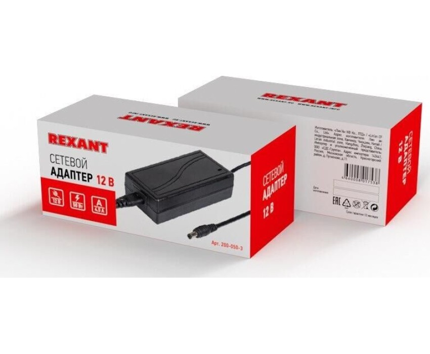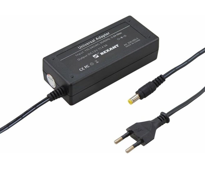 Блок питания REXANT (200-050-3) Источник питания 110-220 V AC/12 V DC 4,5 А 50 W с DC разъемом подключения 5.5х2.1, без влагозащиты (IP23)