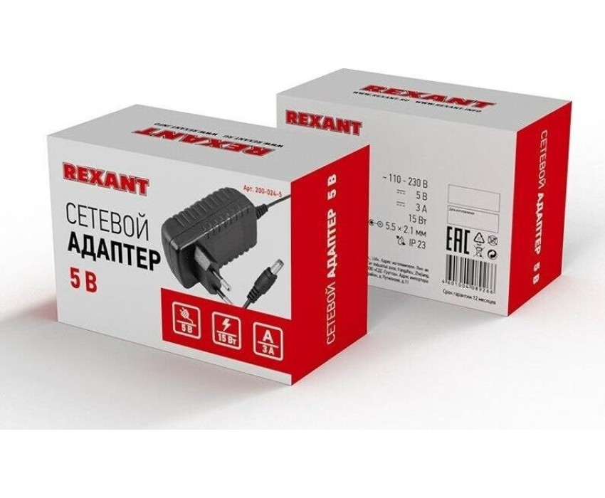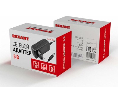 Блок питания REXANT (200-024-5) Источник питания 110-220 V AC/5 V DC 3 А 15 W с DC разъемом подключения 5.5х2.1, без влагозащиты (IP23)
