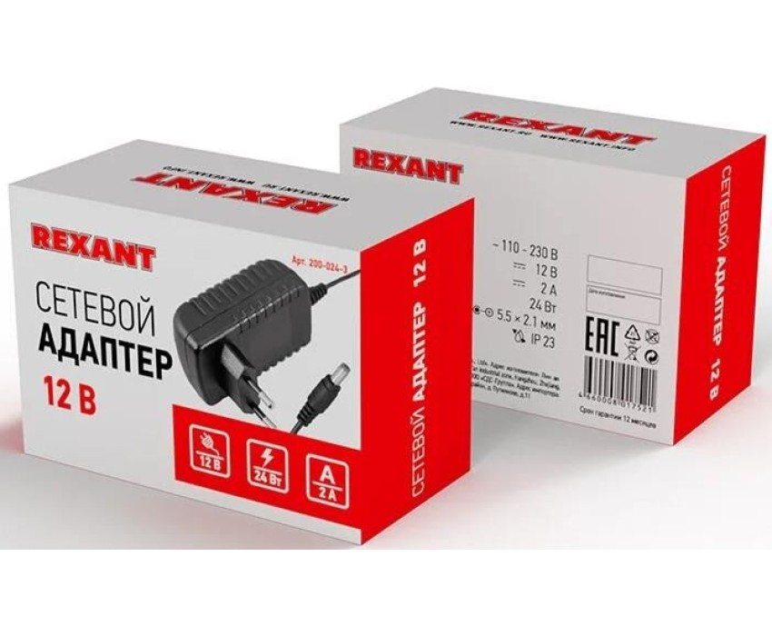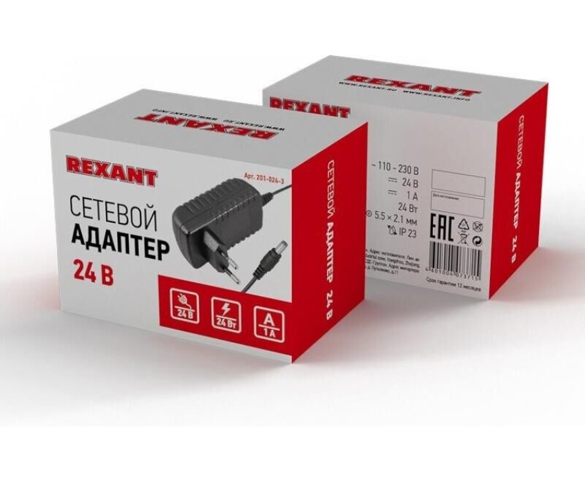Блок питания REXANT (201-024-3) Источник питания 220 V AC/24 V DC 1 А 24 W с DC разъемом подключения 5.5х2.1, без влагозащиты (IP23)
