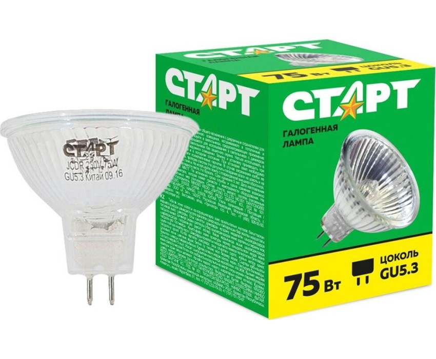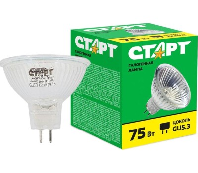 Галогенная лампа. Теплый свет. Напряжение питания 220В, потребляемая мощность 75 Вт. Цоколь GU5.3.