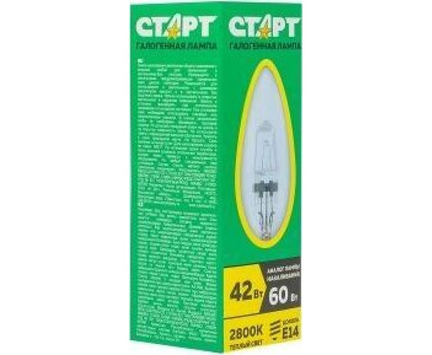 Галогенная лампа. Теплый свет. Потребляемая мощность 42 Вт, аналог лампы накаливания на 85 Вт. Колба - свеча. Цоколь Е14 (миньон).