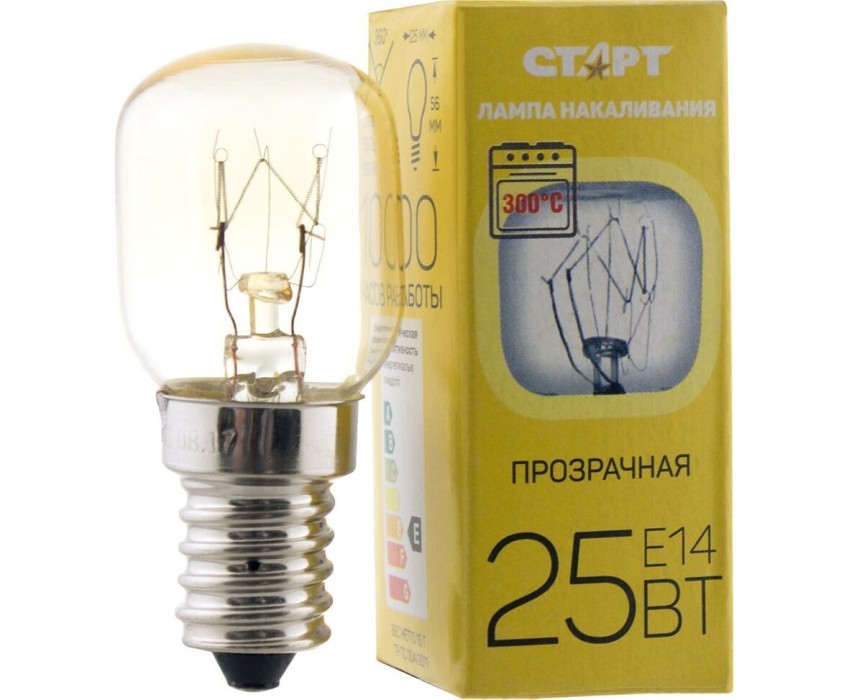 Лампа накаливания СТАРТ OVEN. Прозрачная Мощность 25 Вт. Диаметр 24 мм. Цоколь E14. Для установки в духовой шкаф с максимальной рабочей температурой 300°С