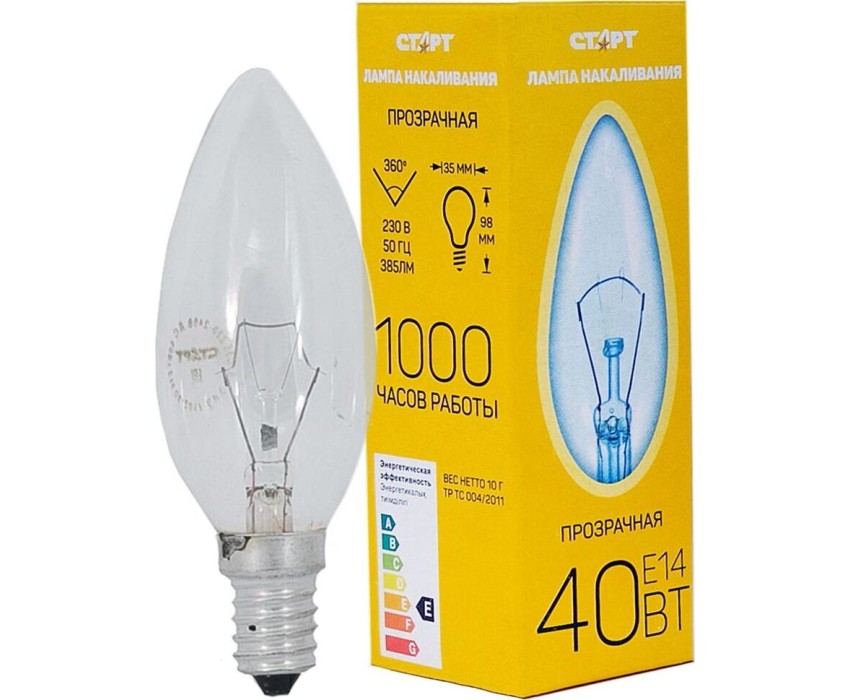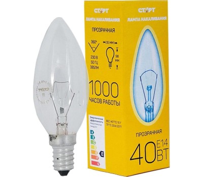 Лампа накаливания. Индивидуальная упаковка из картона. Колба — свеча прозрачная. Мощность 60 Вт. Цоколь Е14 (Миньон).
